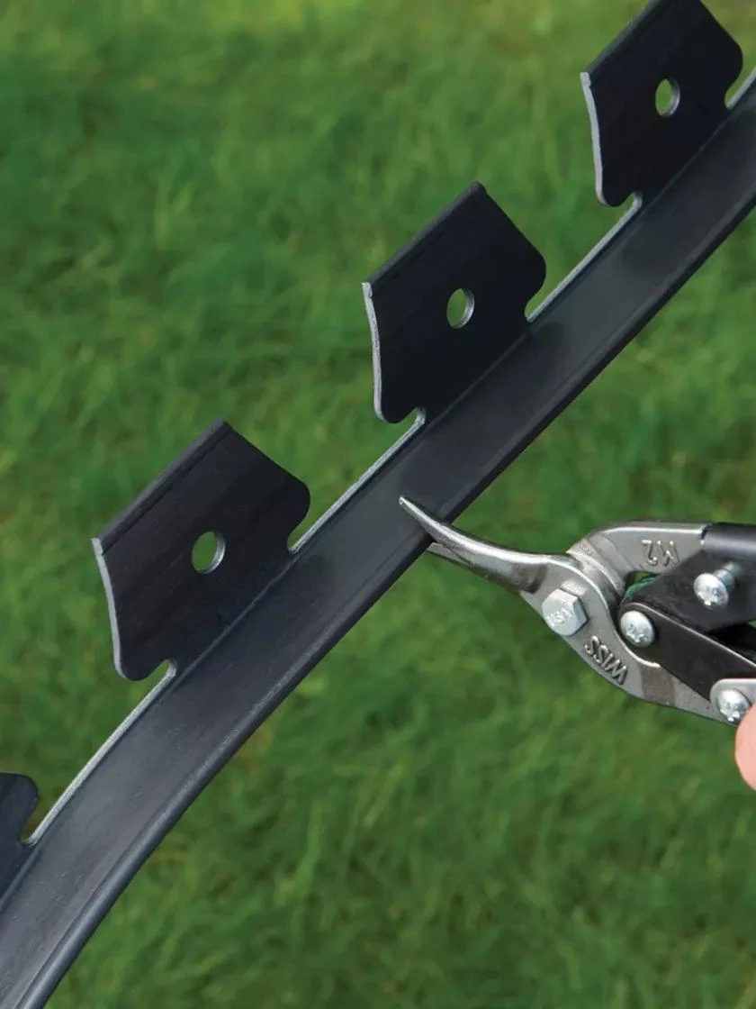 Use this easy-to-install edging to create a tidy border on garden beds, tree rings and walkways. Keeps mulch and gravel contained. No-dig edging installs on the soil surface using the included spikes. Easy to bend into curves. 50′ of edging, 16 spikes and two connectors.